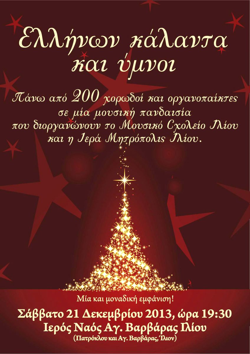 Η συναυλία θα γίνει το Σάββατο 21 Δεκεμβρίου 2013 στις 19:30 στον Ι.Ν. Αγίας Βαρβάρας Ιλίου και θα συμμετάσχουν 200 χορωδοί με τη συνοδεία 20 μουσικών οργάνων. Το Μουσικό Σχολείο Ιλίου φημίζεται για το υψηλό επίπεδο κατάρτισης των καθηγητών και των μαθητών του και πάντοτε δημιουργεί εκδηλώσεις με υψηλή καλλιτεχνική αισθητική. Είμαστε όλοι προσκεκλημένοι.
