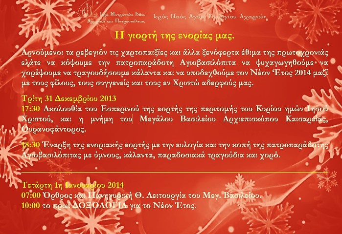 Η χριστουγεννιάτικη γιορτή της ενορίας του Αγ. Γεωργίου Αχαρνών είχε κι εφέτος πλούσιο πρόγραμμα! Τα παιδιά προετοιμάστηκαν και απέδωσαν με τον καλύτερο τρόπο όσα με κέφι και μεράκι τους δίδαξαν οι υπεύθυνοι των κατηχητικών ομάδων. Και του χρόνου!