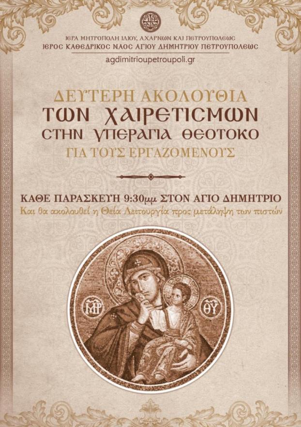 Δεύτερη ακολουθία χαιρετισμών θα τελείται στον Ιερό Ναό Αγίου Δημητρίου Πετρουπόλεως, κάθε Παρασκευή στις 21:30. Θα ακολουθεί Θεία Λειτουργία.