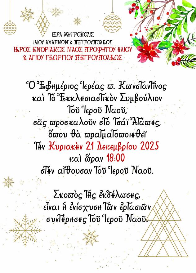 Ἡ Ἐνορία Προφήτου Ἠλιοῦ Πετρουπόλεως, τὴν Κυριακὴ 21 Δεκεμβρίου 2025 καὶ ὥρα 18:00, θὰ πραγματοποιήσει Χριστουγιεννιάτικο Τσάϊ, στὴν αἴθουσα τοῦ Πνευματικοῦ Κέντρου τῆς Ἐνορίας.