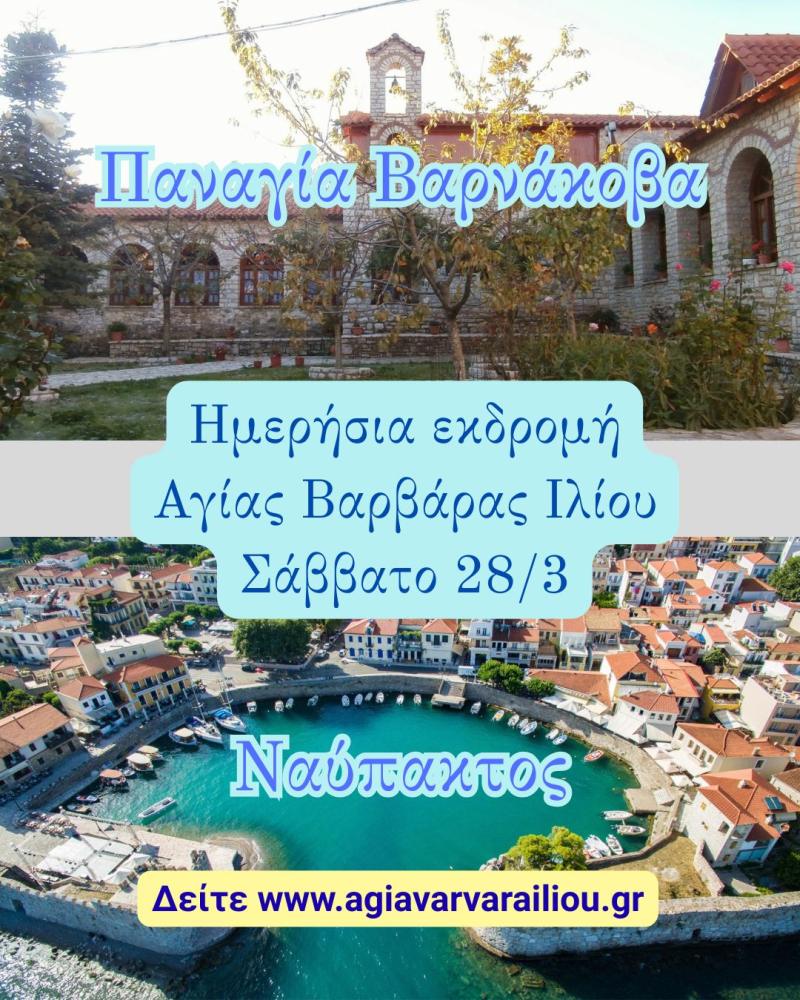 Ημερήσια εκδρομή στην Ιερά Μονή Παναγίας Βαρνάκοβας και την Ναύπακτο θα πραγματοποιήσει η ενορία της Αγίας Βαρβάρας Ιλίου, το Σάββατο 28 Μαρτίου 2026, με αναχώρηση στις 06:45. Όλα τα έσοδα θα διατεθούν για την ολοκλήρωση των έργων αποκατάστασης του Ιερού Ναού.