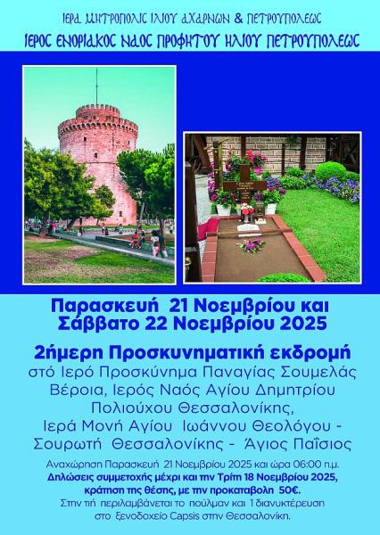 Ἡ Ἐνορία τοῦ Προφήτου Ἠλιοῦ Πετρουπόλεως, θὰ πραγματοποιήσει διήμερη προσκυνηματικὴ ἐκδρομὴ στὴν Θεσσαλονίκη στὸν Ἅγιο Δημήτριο, στὸ Ἱερὸ Προσκύνημα Παναγίας Σουμελὰ Βέροιας καὶ στὴν Ἱερὰ Μονὴ Ἁγίου Ἰωάννου Θεολόγου Σουρωτὴς Θεσσαλονίκης στὸν τάφο τοῦ Ἁγίου Παϊσίου, 21 καὶ 22 Νοεμβρίου 2025, μὲ μία διανυκτέρευση στὸ ξενοδοχεῖο Capsis Hotel στὴν Θεσσαλονίκη.