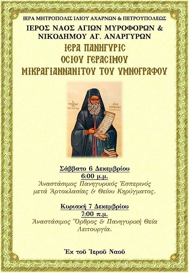 Η ενορία των Αγίων Μυροφόρων και Νικοδήμου πανηγυρίζει τη μνήμη του Οσίου Γερασίμου του Μικραγιαννανίτου, του Υμνογράφου, την Κυριακή 7 Δεκεμβρίου 2025.