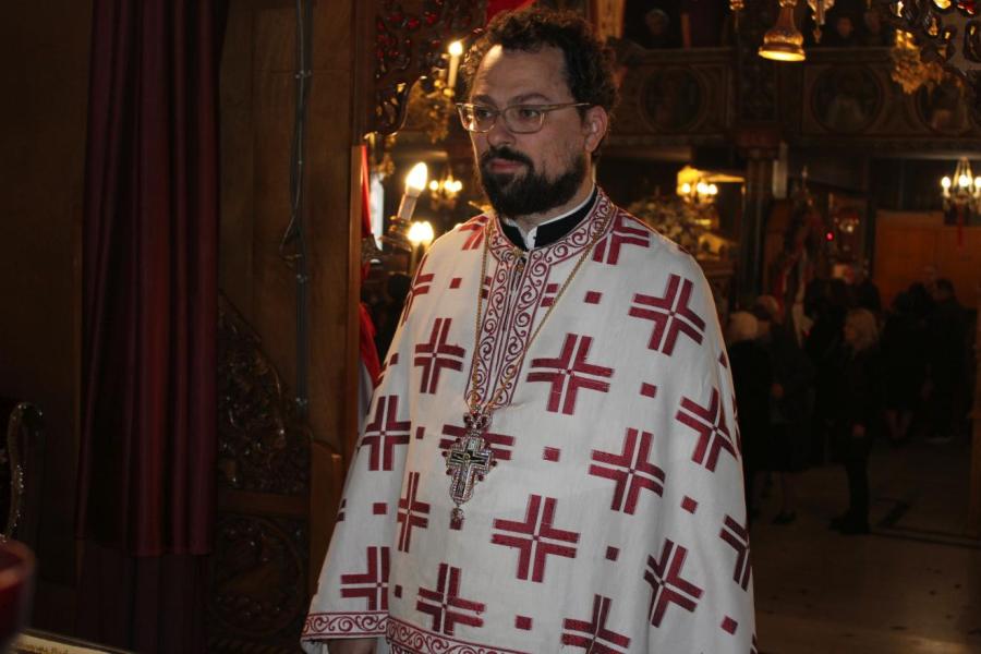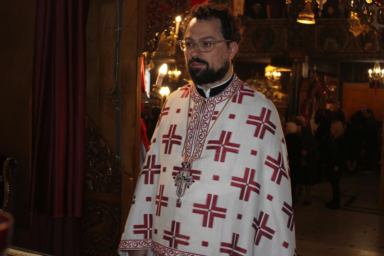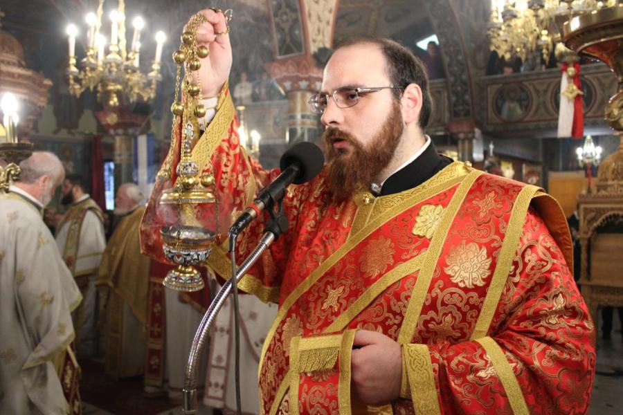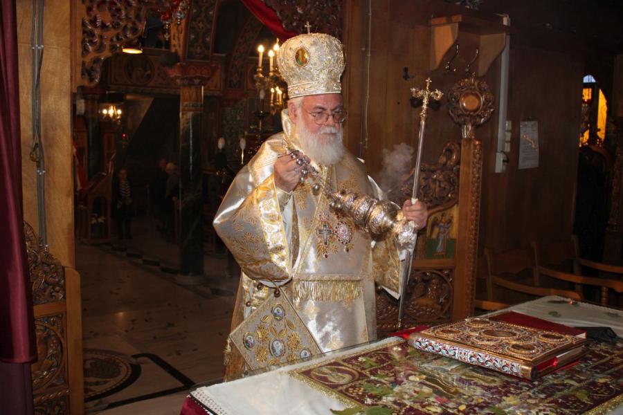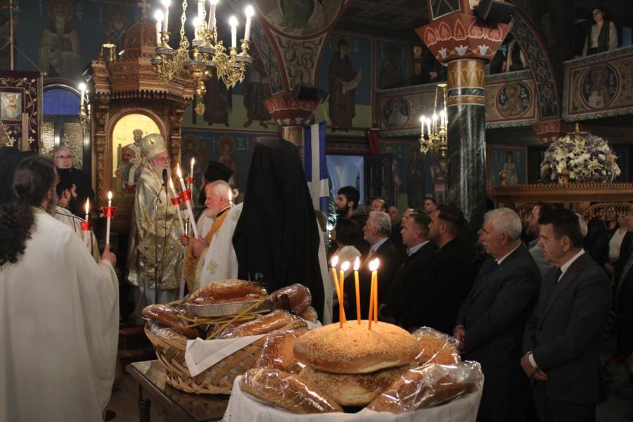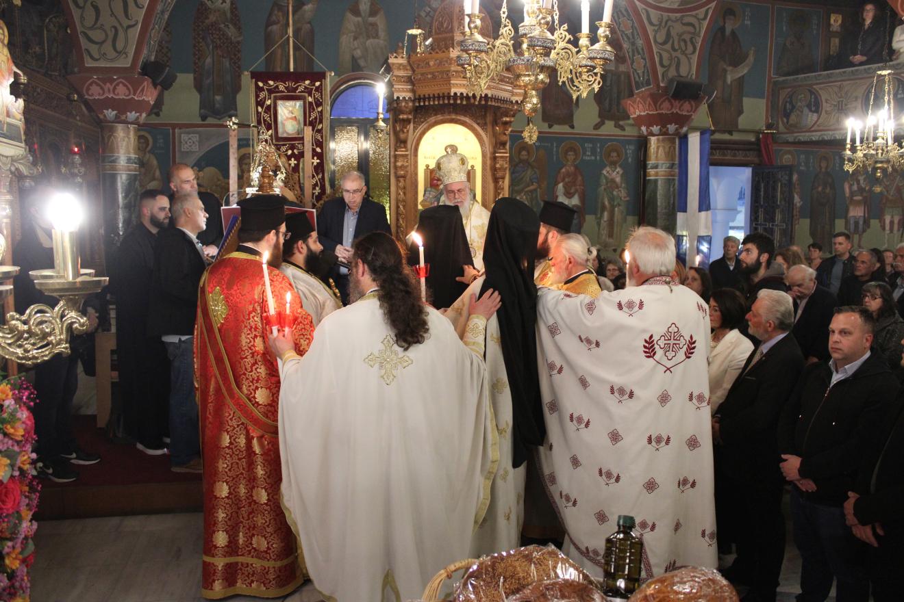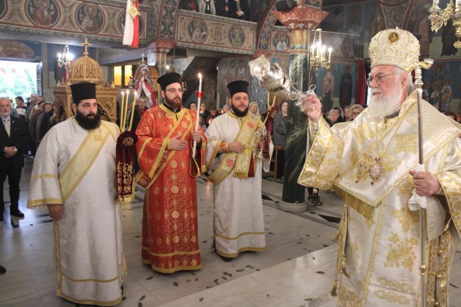 συμπαραστατούμενος από τους Αρχιμ. Συμεών Αυγουστάκη, Πρόεδρο του ΕΣ του εορτάζοντος ιερού ναού, Αρχιμ. Μάξιμο Αδαμίδη, π. Ιωσήφ Έκερτ, π. Νικόλαο Σούλη, εφημερίους του ιερού ναού, π. Γεώργιο Βασιλείου, Πρόεδρο του ΕΣ του Ιερού ενοριακού ναού της αγίας Βαρβάρας στο Ίλιον, π. Κωνσταντίνο Κασσό, Πρόεδρο του ΕΣ του Ιερού ενοριακού ναού του Προφήτου Ηλία στην Πετρούπολη και τους διακόνους του π. Άγγελο Μιχαλόπουλο και π. Καλλίνικο Ζωγράφο.