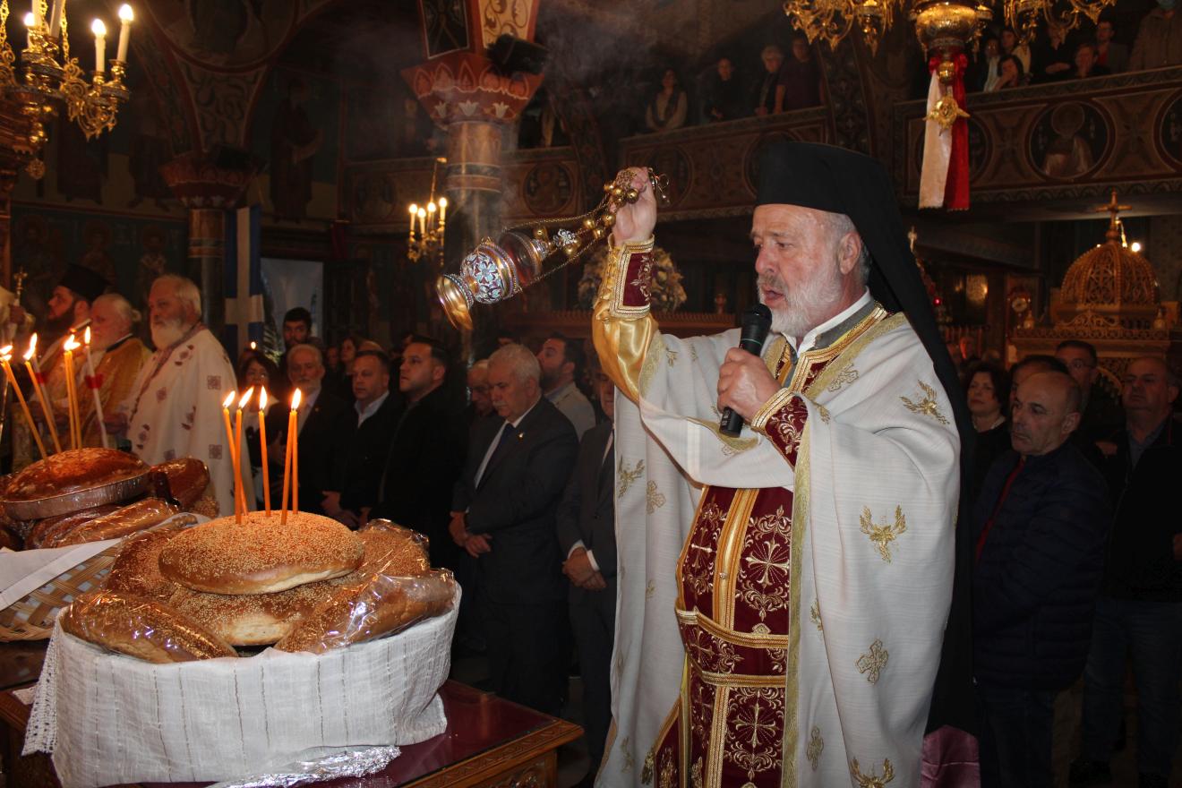Μετά την αρτοκλασία και πριν την απόλυση ο Σεβασμιώτατος με αφορμή το πρώτο τροπάριο των εσπερίων της εορτής: «Ξένα καὶ παράδοξα, τῶν οὐρανῶν ὁ Δεσπότης, ἐπὶ σοὶ τετέλεκε, καταρχὰς Πανάμωμε· καὶ γὰρ ἄνωθεν, ἐμφανῶς ἔσταξεν, ὑετὸς καθάπερ, ἐν τῇ μήτρᾳ σου Θεόνυμφε, Πηγὴν δεικνύων σε, σύμπαν ἀγαθὸν ἀναβλύζουσαν, πλημμύραν τε ἰάσεων, τὰς εὐεργεσίας προρρέουσαν ἅπασιν ἀφθόνως, τοῖς χρῄζουσι τὴν ῥῶσιν τῶν ψυχῶν, καὶ τήν ὑγείαν τοῦ σώματος, ὕδατι τῆς χάριτος», το οποίο συνδέεται άμεσα μεν με το αναστάσιμο κλίμα της περιόδου, αναφέρεται δε στο παράδοξο γεγονός της ενσάρκωσης του Θεού μέσω της Παρθένου, η οποία έγινε πηγή ζωής, καθώς γέννησε το «ύδωρ το ζών», τον Χριστό και παρέχει ιάματα και ψυχικά και σωματικά σε όσους την επικαλούνται με πίστη, υπογραμμίζοντας έτσι τον διπλό ρόλο της Παναγίας, ως της Μητέρας του Θεού και της «Ζωοδόχου Πηγής» και ευχήθηκε σε όλους με τον αναστάσιμο χαιρετισμό «Χριστός Ανέστη», έτη πολλά και ευλογημένα.