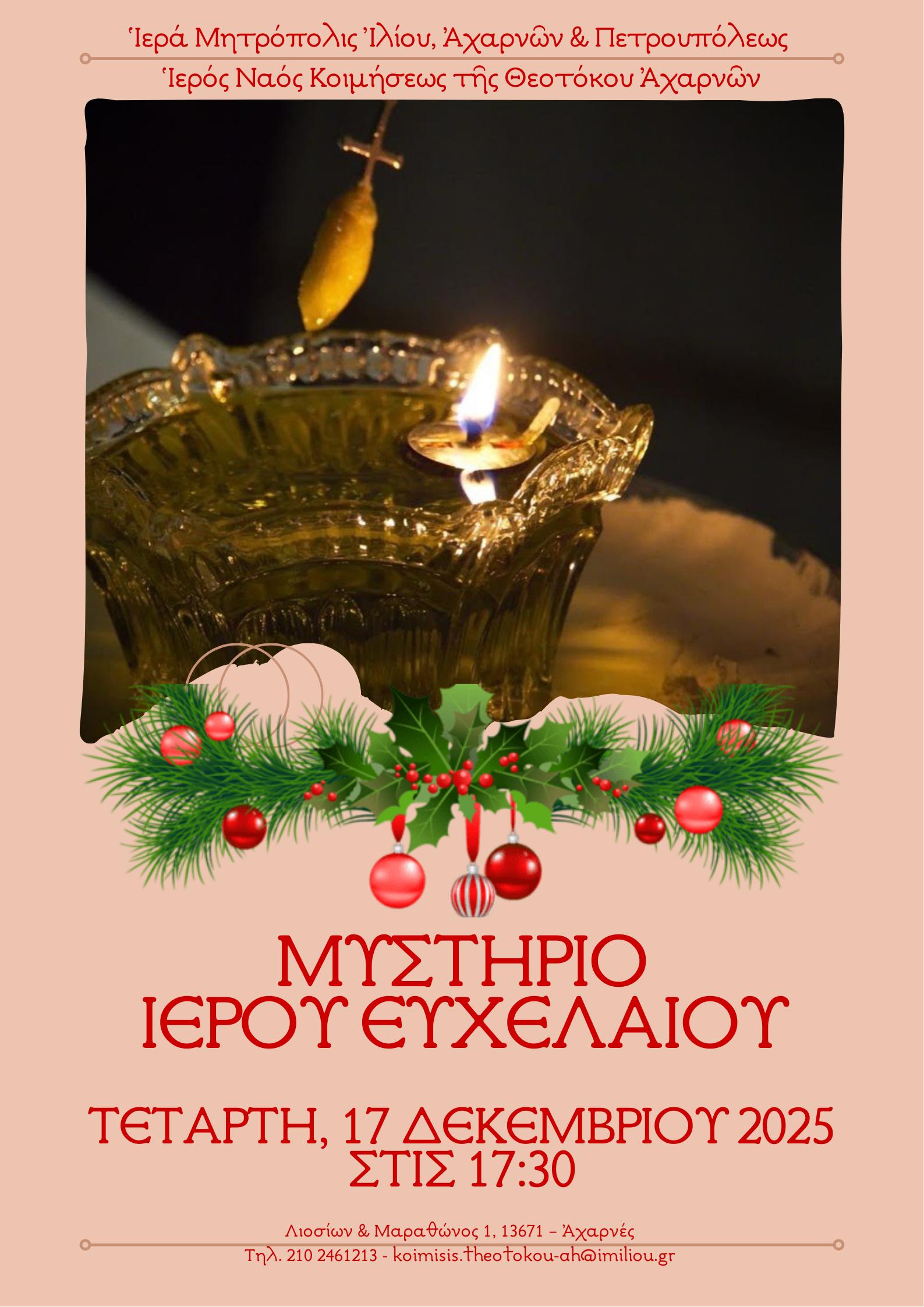 Το μυστήριο του Ευχελαίου θα τελεστεί στον Ιερό Ναό Κοιμήσεως Θεοτόκου Αχαρνών την Τετάρτη 17 Δεκεμβρίου 2025, στις 17:30.