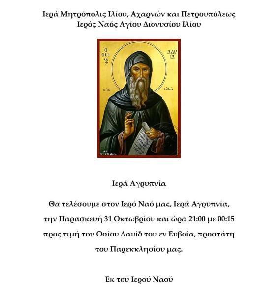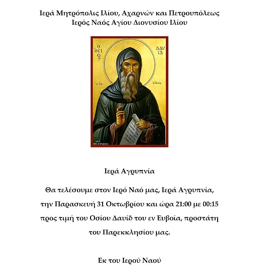 Ιερά αγρυπνία επί τη μνήμη του Οσίου Δαυίδ του εν Ευβοία, προστάτου του παρεκκλησίου της ενορίας, θα πραγματοποιηθεί στον Ιερό Ναό Αγίου Διονυσίου Ιλίου, την Παρασκευή 31 Οκτωβρίου 2025 από 21:00 έως 00:15.