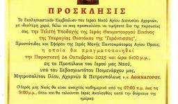 Το Εκκλησιαστικό Συμβούλιο του Ιερού Ναού Αγίου Διονυσίου Αχαρνών με ιδιαίτερη χαρά θέλει να σας προσκαλέσει να τιμήσετε δια της παρουσίας σας την τελετή υποδοχής της Ιεράς Θαυματουργού Εικόνος της Υπεραγίας Θεοτόκου της «Γερόντισσας», προστάτιδος και εφόρου της Ιεράς Μονής Παντοκράτορος Αγίου Όρους.