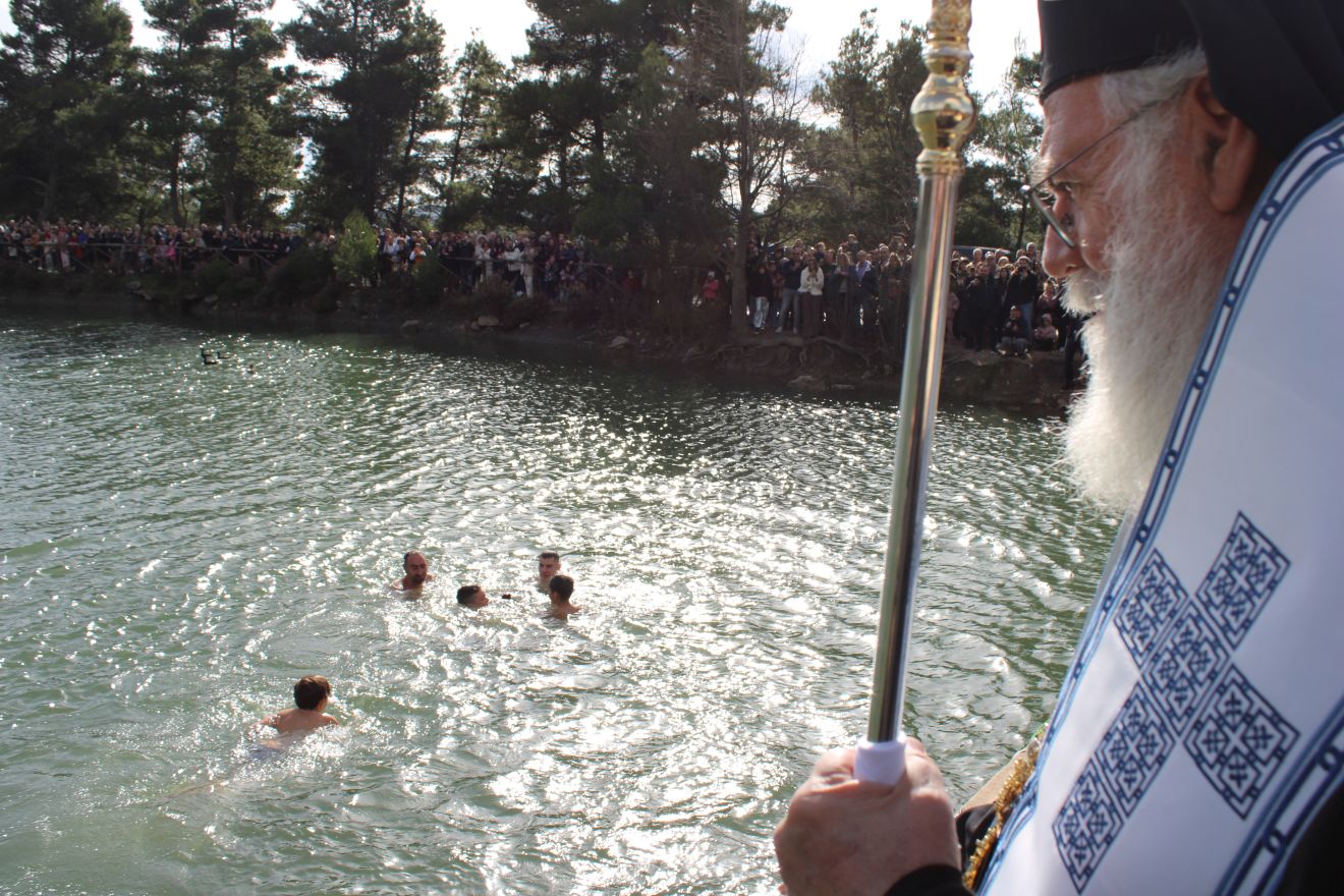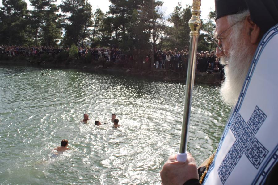 Στη λίμνη συναγωνίσθηκαν για την λήψη του Τιμίου Σταυρού μικρή ομάδα αγοριών.