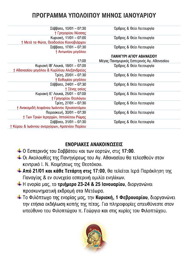 Δείτε το πρόγραμμα ακολουθιών μηνός Ιανουαρίου 2026, μετά το Άγιο Δωδεκαήμερο, στην ενορία Κοιμήσεως Θεοτόκου Αχαρνών.