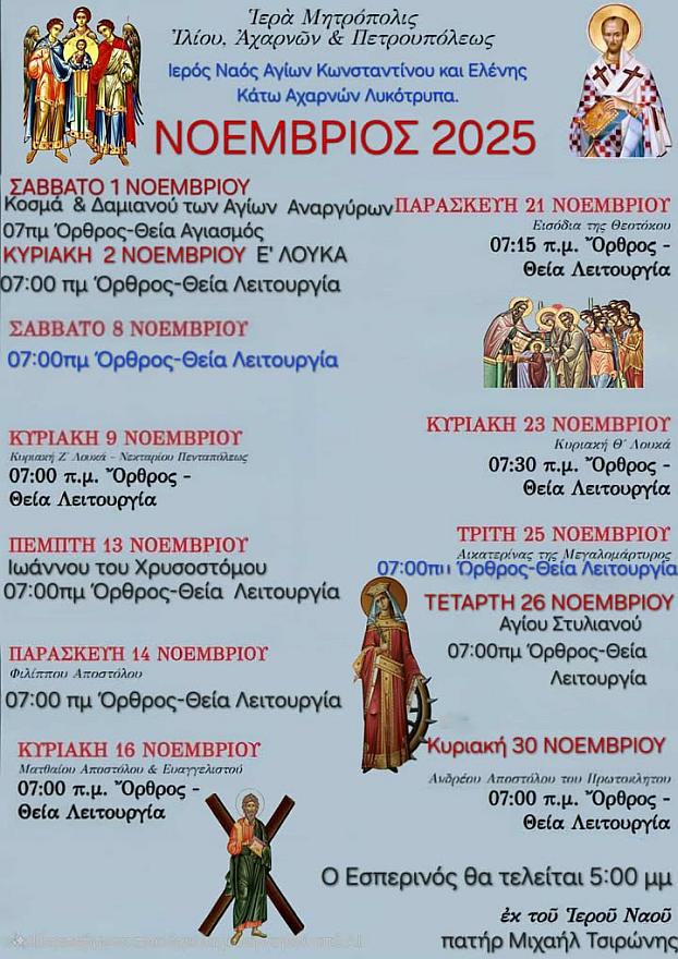 Δείτε το πρόγραμμα ακολουθιών μηνός Νοεμβρίου 2025 στην ενορία των Αγίων Κωνσταντίνου και Ελένης Κάτω Αχαρνών.