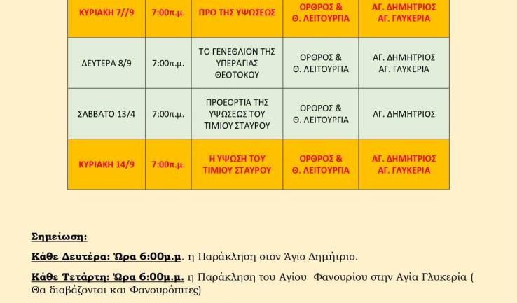 Πρόγραμμα ακολουθιών Α' δεκαπενθημέρου Σεπτεμβρίου 2025 ενορίας Αγ. Δημητρίου Πετρ.