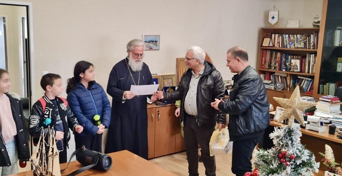 Ως ένδειξη αγάπης και ευγνωμοσύνης, η Ιερά Μητρόπολη προσέφερε συμβολικά σε όλα τα παιδιά δώρα γραφικής ύλης, μία ιερή εικόνα με το απολυτίκιο των Θεοφανείων «Ἐν Ἰορδάνῃ βαπτιζομένου Σου, Κύριε…», καθώς και εορταστικό κέρασμα, ολοκληρώνοντας με όμορφο τρόπο αυτή τη ζεστή και εγκάρδια επίσκεψη.
