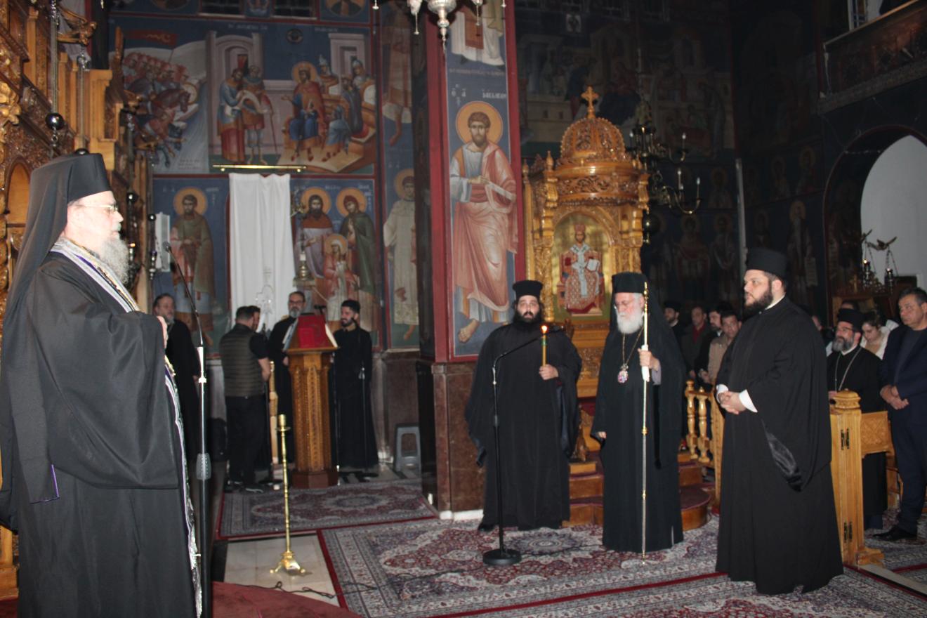 συμπαραστατούμενος από τους Αρχιμ. Ιωάννη Ράπτη - Γενικό Αρχιερατικό Επίτροπο της Ιεράς Μητροπόλεως, Αρχιμ. Αγαθάγγελο Κόκλα - ιεροκήρυκα της Ιεράς Μητροπόλεως, Αρχιμ. Τίτο Χρήστου - Πρόεδρο του Εκκλ. Συμβουλίου του Ιερού Ναού και Αρχιερατικό Επίτροπο Φυλής και Αχαρνών, Αρχιμ. Εφραίμ Χριστοφοράκη - Πρόεδρο του Εκκλ. Συμβουλίου του Ι. Ν. Αγ. Δημητρίου Πετρουπόλεως και Αρχιερατικό Επίτροπο Πετρουπόλεως, Αρχιμ. Μιχαήλ Γιαννακέλο - Πρόεδρο του Εκκλ. Συμβουλίου του Ι. Ν. Κοιμήσεως της Θεοτόκου Αχαρνών, π. Πέτρο Θεοδοσίου - Πρόεδρο του Εκκλ. Συμβουλίου του Ι. Ν. Αγ. Παντελεήμονα Κρυονερίου, π. Ευάγγελο Κοντογιάννη - Πρόεδρο του του Εκκλ. Συμβουλίου του Ι. Ν. Αγ. Γεωργίου Αχαρνών, π. Φανούριο Μπριλή - Πρόεδρο του Εκκλ. Συμβουλίου του Ι. Ν. Αγ. Δημητρίου Άνω Λιοσίων, τους εφημερίους του Ιερού Ναού, εφημερίους ομόρων ενοριών από τις αρχιερατικές περιφέρειες Άνω Λιοσίων και Αχαρνών και τους διακόνους του π. Άγγελο Μιχαλόπουλο και π. Καλλίνικο Ζωγράφο.