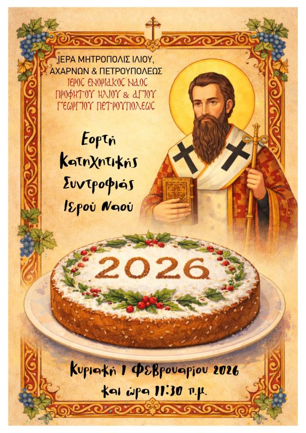 Τὴν Κυριακὴ 1 Φεβρουαρίου 2026 καὶ ὥρα 11:30, θὰ πραγματοποιηθεῖ ἡ Πρωτοχρονιάτικη ἑορτὴ καὶ ἡ κοπὴ Ἁγιοβασιλόπιτας, τῆς Κατηχητικῆς Συντροφιᾶς τοῦ Ἱεροῦ Ναοῦ Προφήτου Ἠλιοῦ Πετρουπόλεως.