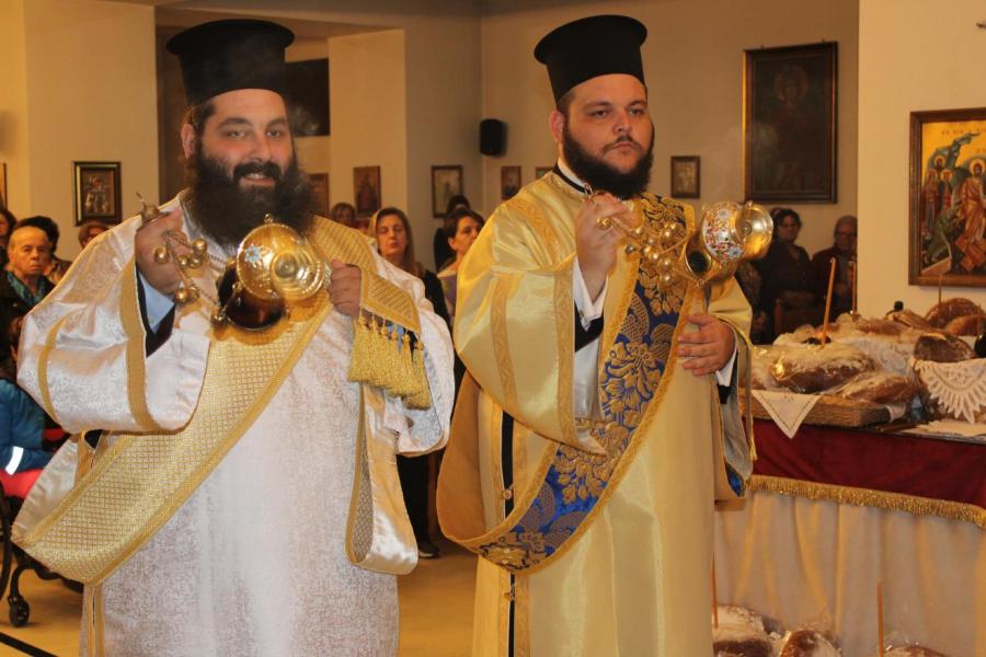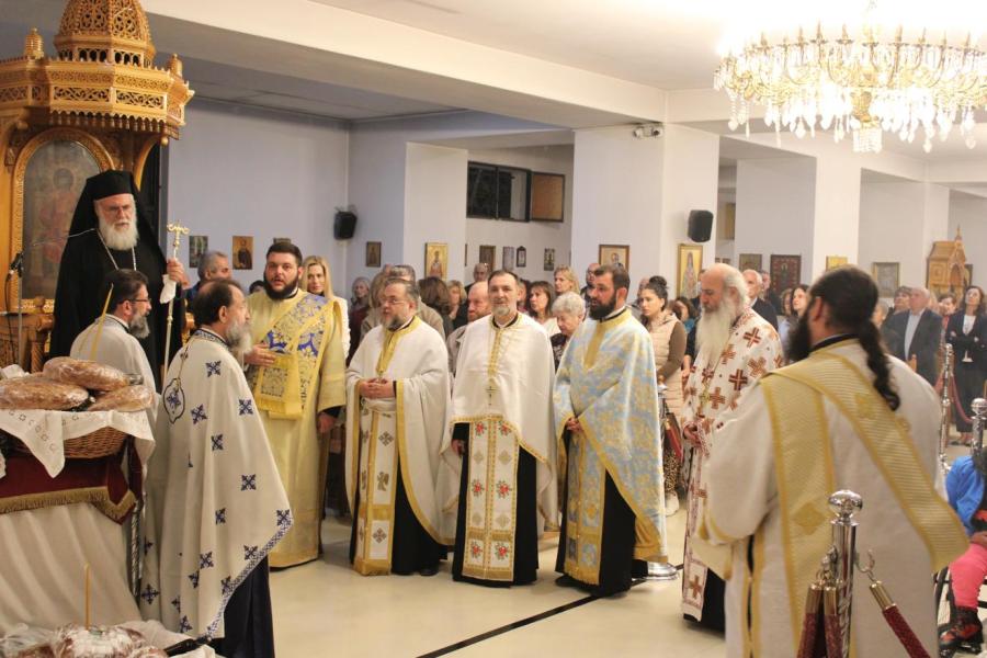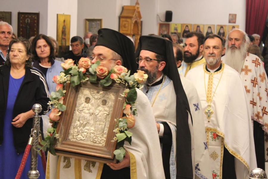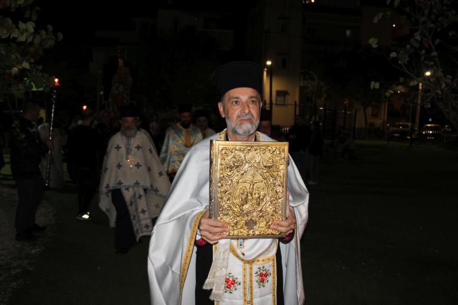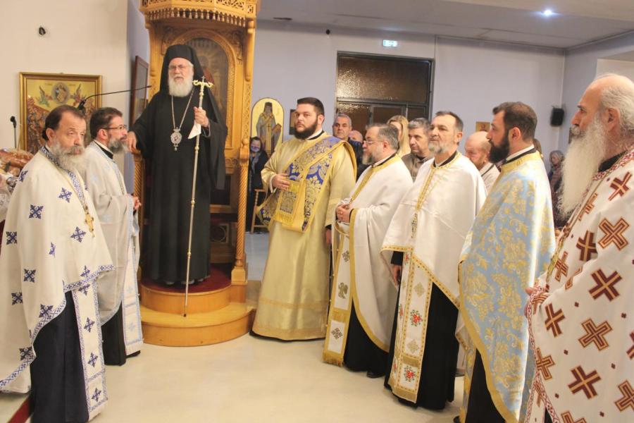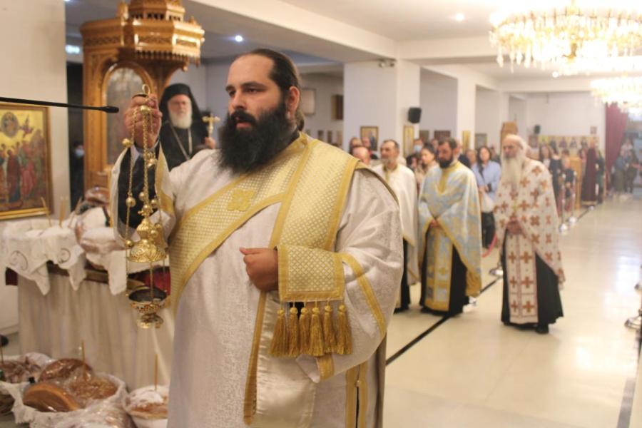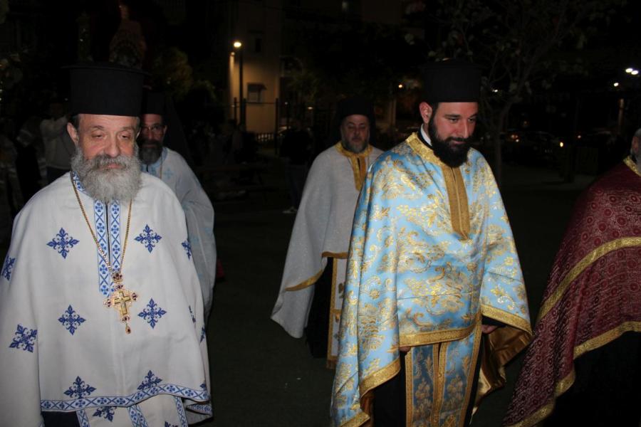 συμπαραστατούμενος από τους Αρχιμανδρίτες Ιωάννη Ράπτη - Γενικό Αρχιερατικό Επίτροπο της Ιεράς Μητροπόλεως Ιλίου, Αχαρνών και Πετρουπόλεως και Τίτο Χρήστου - Αρχιερατικό Επίτροπο Φυλής και Αχαρνών, τους πατέρες Νικόλαο Πουρσανίδη - Πρόεδρο του Εκκλ. Συμβουλίου του εορτάζοντος Ιερού Ναού, Λάμπρο Καρίνο - Πρόεδρο του Εκκλ. Συμβουλίου του Ι.Ν. Αγίας Τριάδος Θρακομακεδόνων, Ευάγγελο Λάζο - Πρόεδρο του Εκκλ. Συμβουλίου του Ι.Ν. Πέτρου και Παύλου Αχαρνών, Κωνσταντίνο Μανώλη - εφημέριο του Ιερού Ενοριακού Ναού Αγίου Γεωργίου Αχαρνών, Μιχαήλ Κάρ - εφημέριο του Ι.N. Κοιμήσεως της Θεοτόκου Αχαρνών και τους διακόνους του π. Άγγελο Μιχαλόπουλο και π. Καλλίνικο Ζωγράφο.