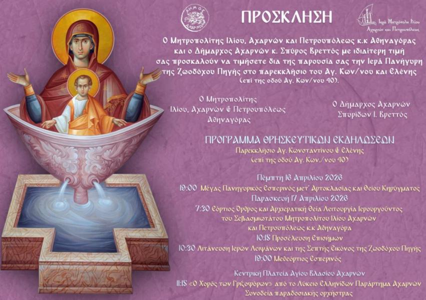 Ο Μητροπολίτης Ιλίου, Αχαρνών και Πετρουπόλεως κ. Αθηναγόρας και ο Δήμαρχος Αχαρνών κ. Σπύρος Βρεττός με ιδιαίτερη τιμή σας προσκαλούν να τιμήσετε δια της παρουσίας σας την Ιερά Πανήγυρη της Ζωοδόχου Πηγής στο παρεκκλήσιο των Αγίων Κωνσταντίνου και Ελένης (διεύθυνση: Αγίου Κωνσταντίνου 40).