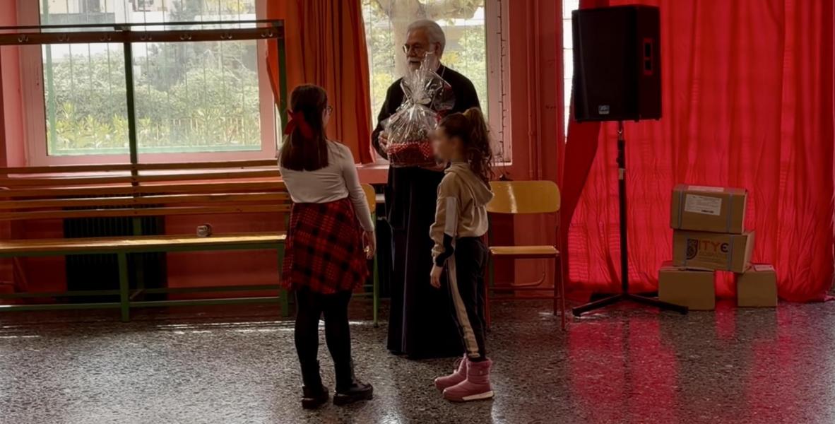 Ακολούθησε ανάγνωση ενός ιδιαίτερα επίκαιρου μηνύματος από τα παιδιά, που μεταξύ άλλων ανέφερε: «Μαζί με την αναστάσιμη λαμπάδα να ανάψουμε την ελπίδα για ένα καλύτερο αύριο», ενώ στο τέλος ευχήθηκαν όλα μαζί: «Σας ευχόμαστε Καλό Πάσχα, με υγεία, αγάπη και ειρήνη σε όλο τον κόσμο». Στη συνέχεια, δώρισαν στον Σεβασμιώτατο ένα όμορφο καλάθι με παραδοσιακά κουλούρια - λαζαράκια (γνωστά και ως λαζαρίτσες), που είχαν φτιάξει οι μαθητές με τους γονείς τους.