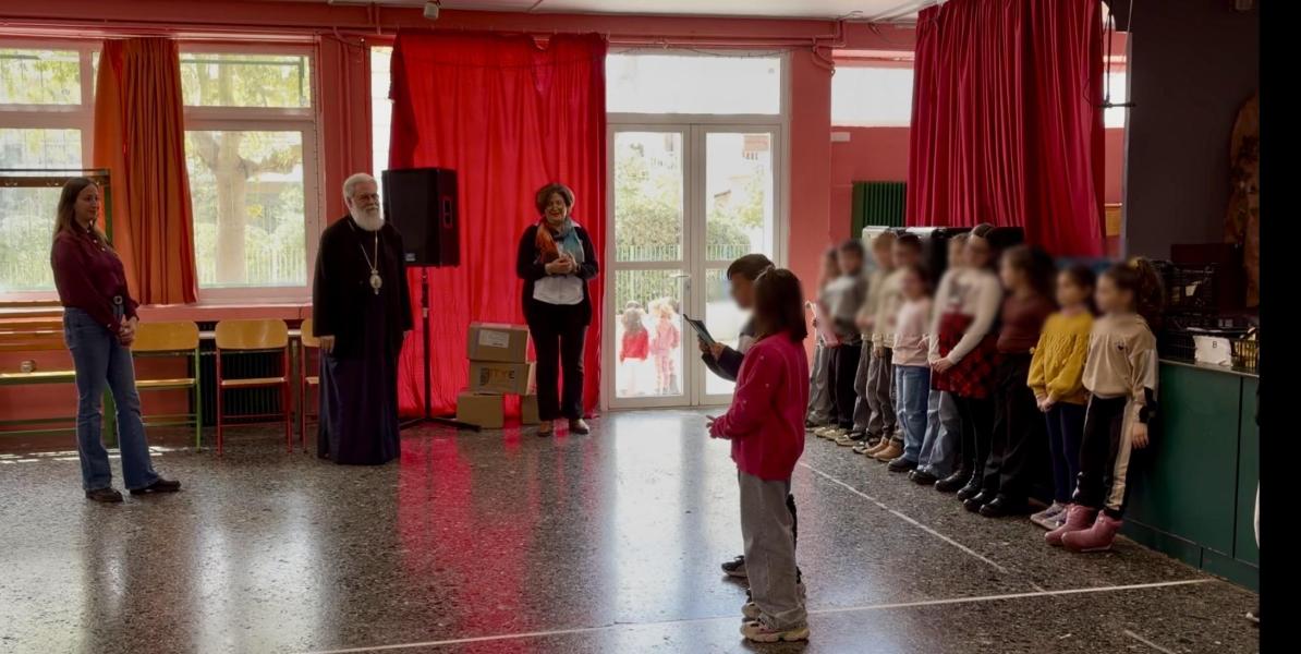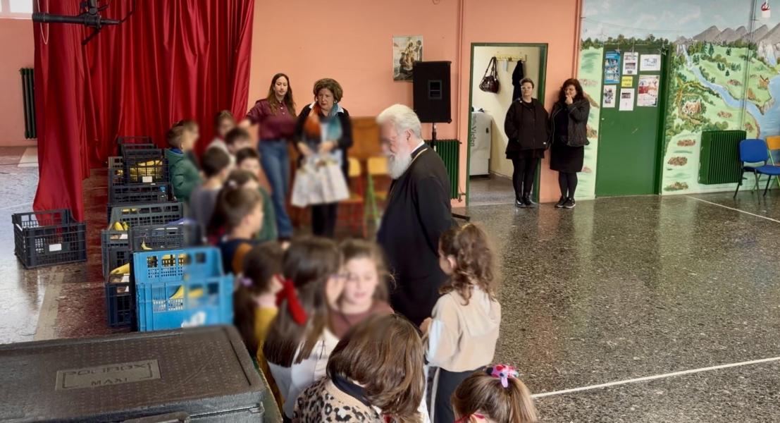 Μετά από σύντομη συζήτηση με εκπαιδευτικούς στο γραφείο διδασκόντων, ο Σεβασμιώτατος μετέβη στην αίθουσα εκδηλώσεων, όπου πραγματοποιήθηκε η προγραμματισμένη δράση. Η υποδοχή των παιδιών ήταν ιδιαίτερα θερμή, όπως μαρτυρούσαν τα χαρούμενα και φωτεινά τους πρόσωπα, τόσο κατά τη διάρκεια της σύντομης εκδήλωσης όσο και στη συνέχεια της επικοινωνίας τους με τον Ποιμενάρχη.