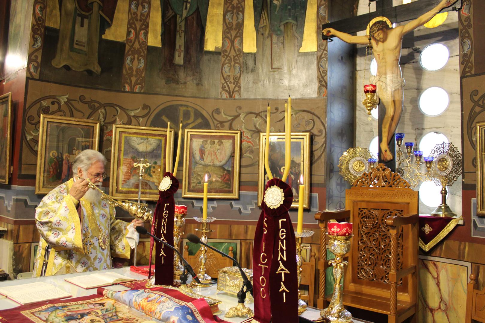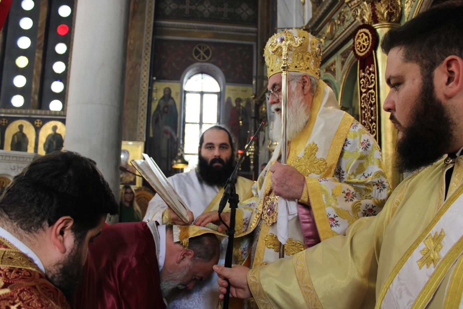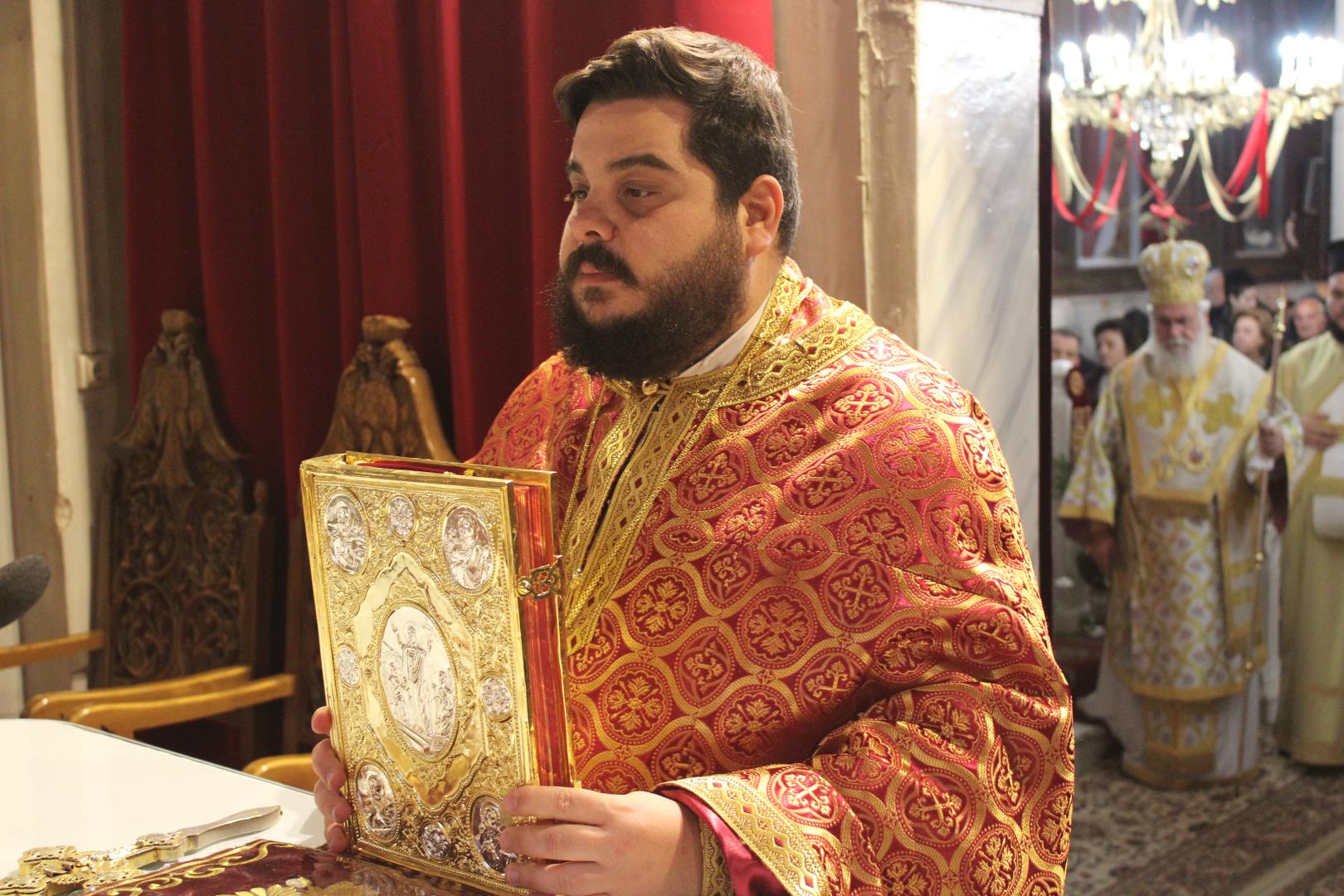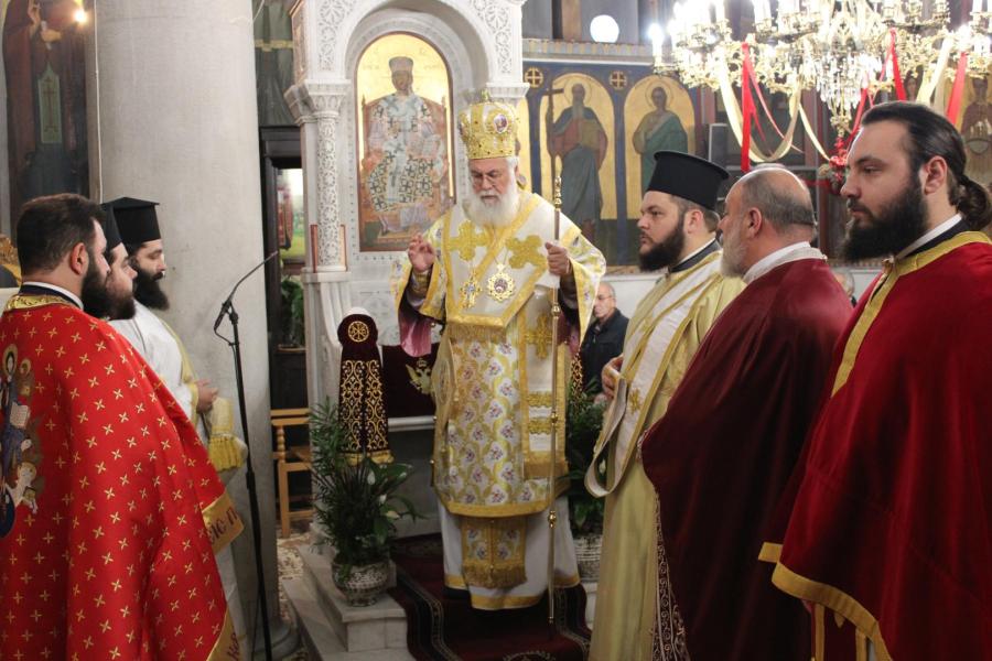συμπαραστατούμενος από τους π. Μιχαήλ Γιαννακέλο, Πρόεδρο του Εκκλ. Συμβουλίου του Ιερού Ναού, τους συνεφημερίους του π. Γεώργιο Χαλκιά, π. Μιχαήλ Καρ και π. Νεκτάριο Τριβέλλα και τους διακόνους του π. Άγγελο Μιχαλόπουλο και π. Καλλίνικο Ζωγράφο.