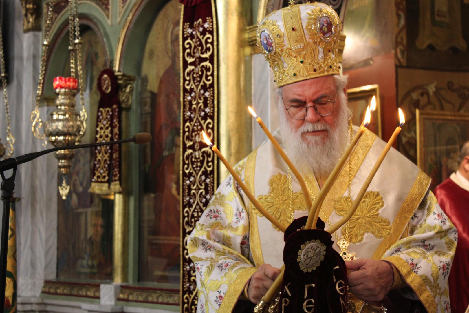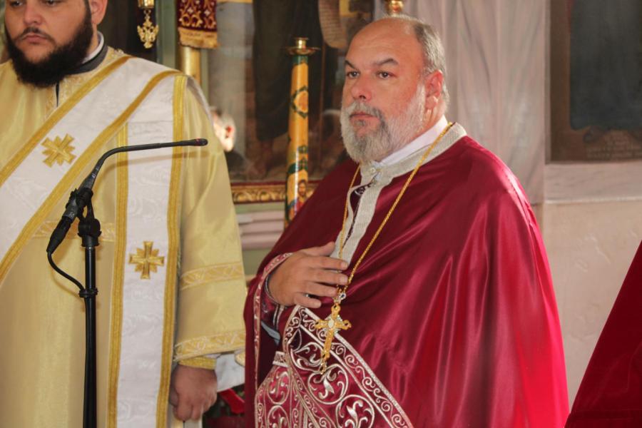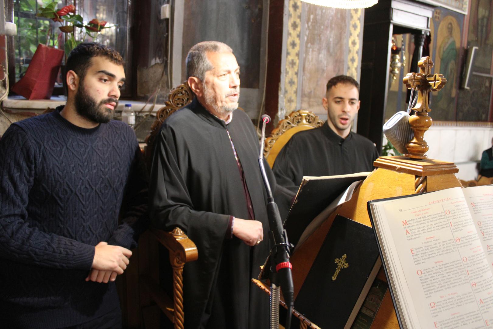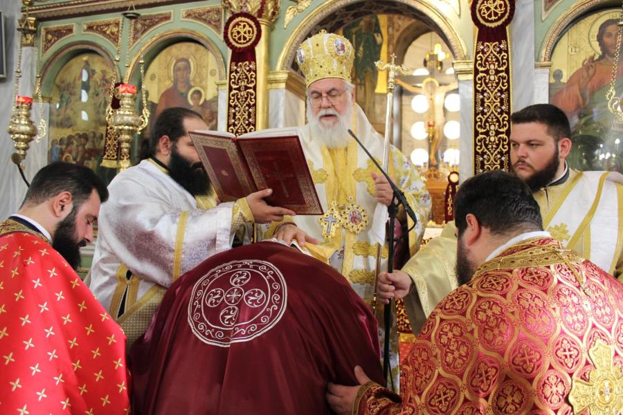 συμπαραστατούμενος από τους π. Μιχαήλ Γιαννακέλο, Πρόεδρο του Εκκλ. Συμβουλίου του Ιερού Ναού, τους συνεφημερίους του π. Γεώργιο Χαλκιά, π. Μιχαήλ Καρ και π. Νεκτάριο Τριβέλλα και τους διακόνους του π. Άγγελο Μιχαλόπουλο και π. Καλλίνικο Ζωγράφο.