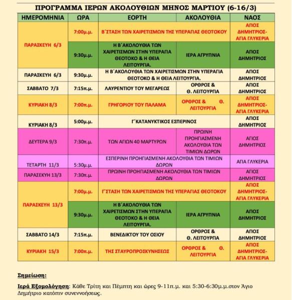 Πρόγραμμα ακολουθιών 6-16/3 Αγίου Δημητρίου Πετρ.