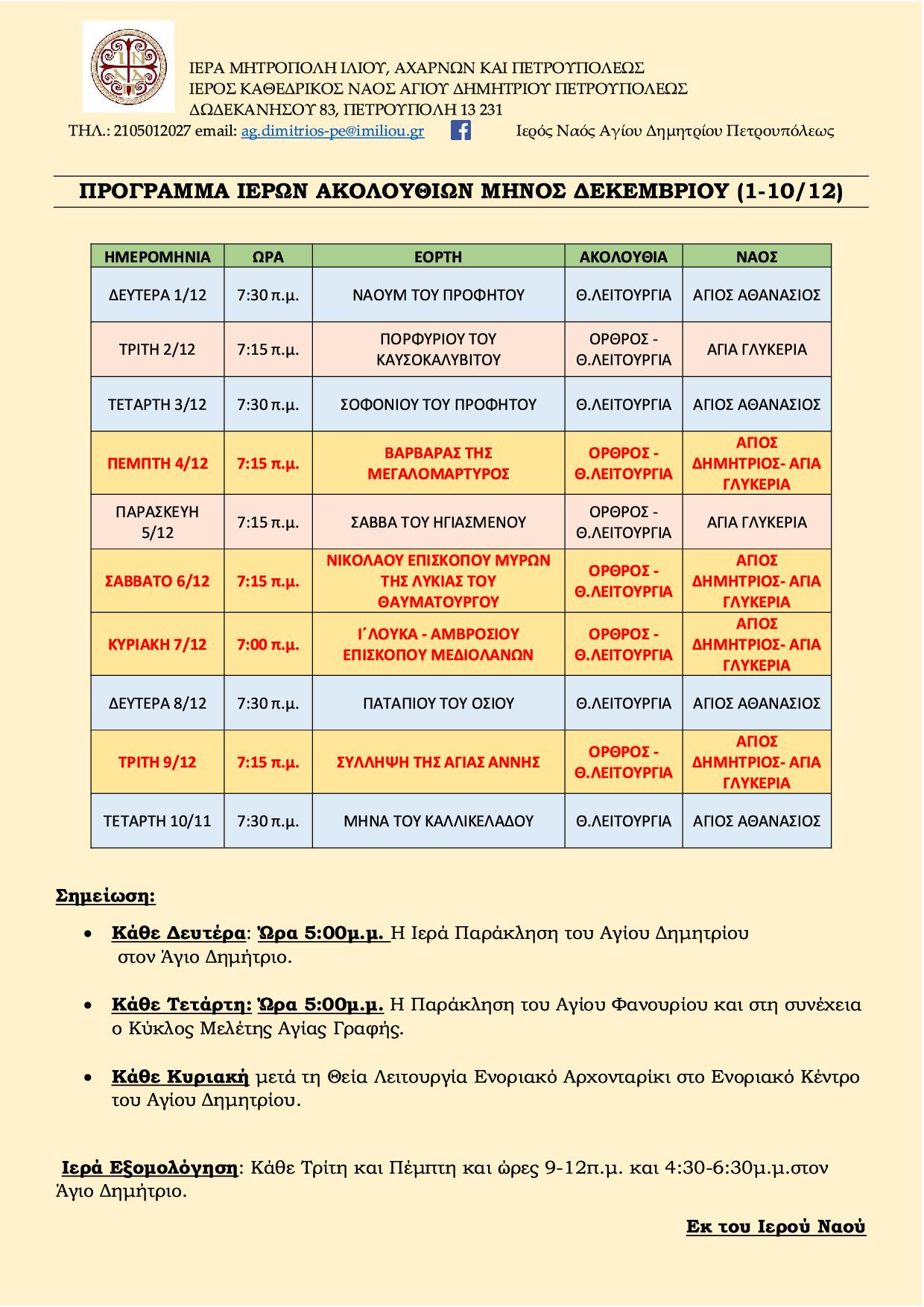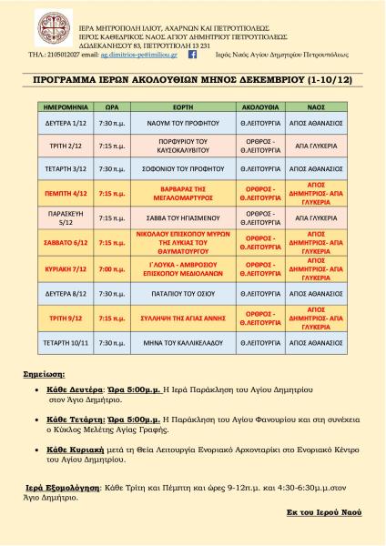 Πρόγραμμα ακολουθιών Α' δεκαημέρου Δεκεμβρίου 2025 ενορίας Αγ. Δημητρίου Πετρ.