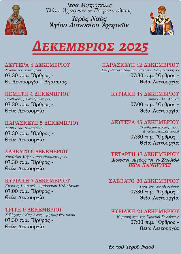 Πρόγραμμα ακολουθιών Δεκεμβρίου 2025 Αγ. Διονυσίου Αχαρνών