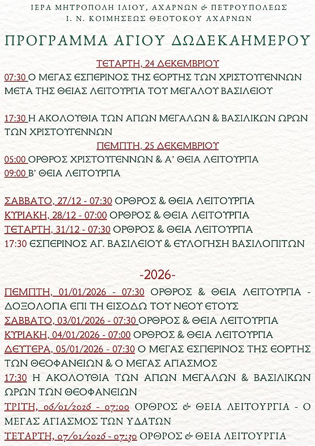 Πρόγραμμα ακολουθιών Δωδεκαημέρου ενορίας Κοιμήσεως Θεοτόκου Αχαρνών