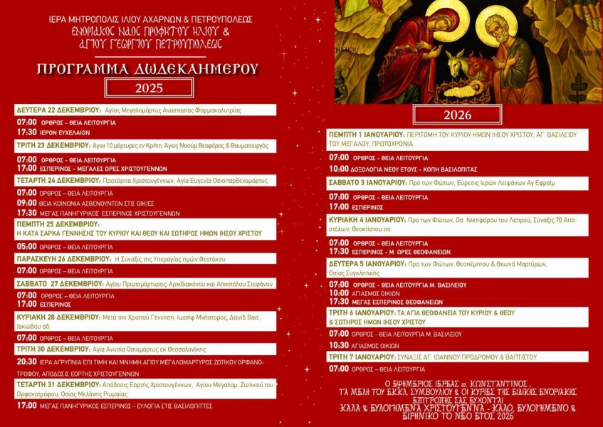 Παρακάτω μπορεῖτε νὰ δεῖτε, τὸ Λατρευτικὸ Πρόγραμμα Ἱερῶν Ἀκολουθιῶν τοῦ Ἁγίου Δωδεκαημέρου, τοῦ Ἱεροῦ Ναοῦ Προφήτου Ἠλιοῦ Πετρουπόλεως.