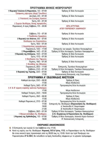 Πρόγραμμα ακολουθιών Φεβρουαρίου 2026 ενορίας Κοιμήσεως Θεοτόκου Αχαρνών