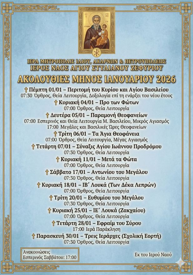 Δείτε το πρόγραμμα ακολουθιών μηνός Ιανουαρίου 2026, στην ενορία Αγίου Στυλιανού Ζεφυρίου.