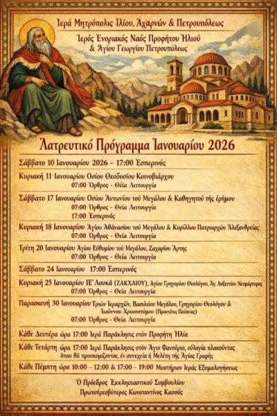 Παρακάτω μπορεῖτε νὰ δεῖτε τὸ Λατρευτικὸ Πρόγραμμα Ἱερῶν Ἀκολουθιῶν τῆς Ἐνορίας Προφήτου Ἠλιοῦ Πετρουπόλεως, γιὰ τὸ ὑπόλοιπο τοῦ μῆνα Ἰανουαρίου 2026.