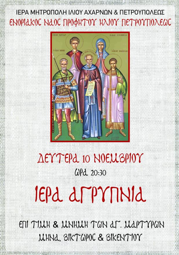 - Δευτέρα 10 Νοεμβρίου, ώρα 20:00, Ιερά αγρυπνία, επί τιμή και μνήμη των Αγίων Μηνά, Βίκτωρος και Βικεντίου.