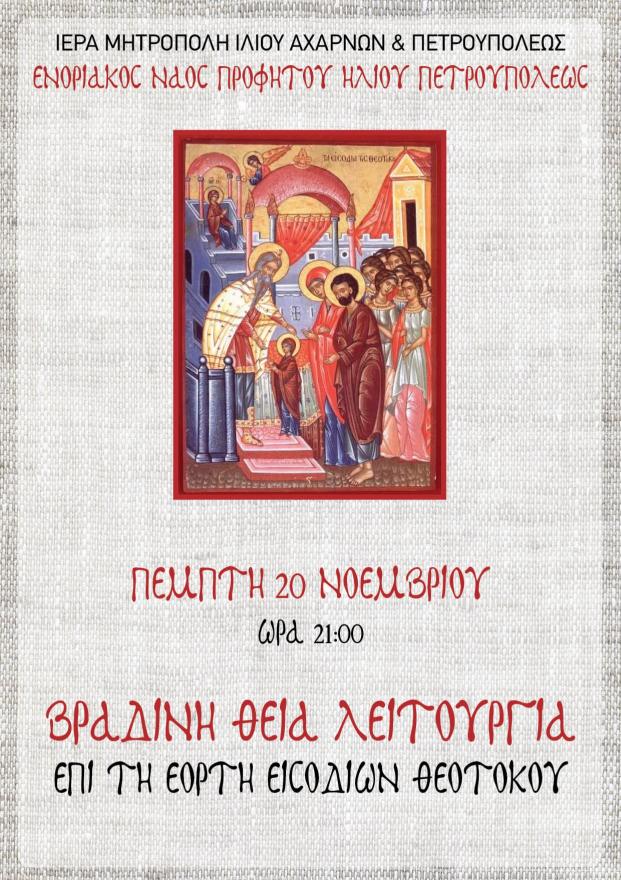 - Πέμπτη 20 Νοεμβρίου, ώρα 21:00, βραδινή Θεία Λειτουργία, επί τη εορτή των Εισοδίων της Υπεραγίας ημών Θεοτόκου και Αειπαρθένου Μαρίας.