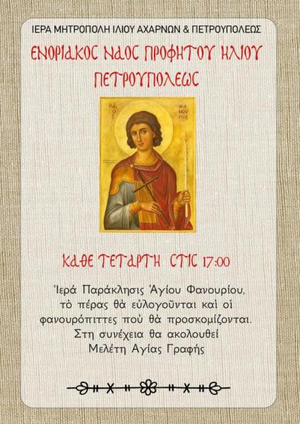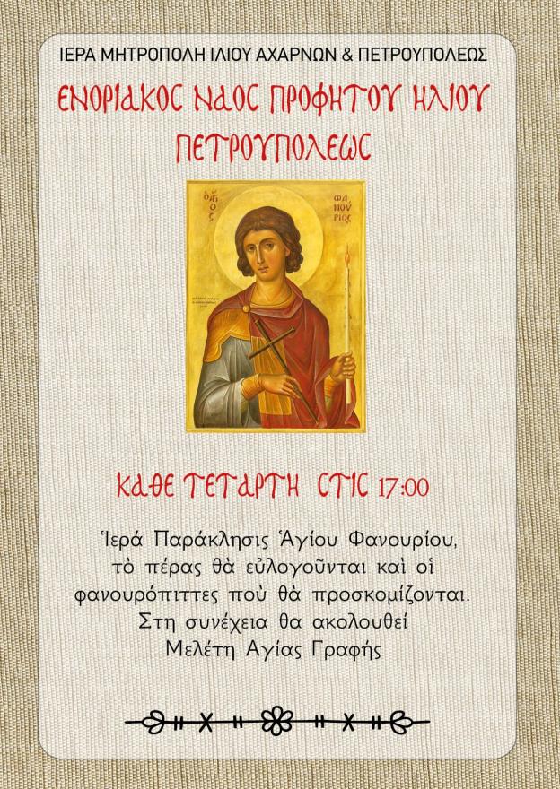 - Κάθε Τετάρτη, ώρα 17:00, Ιερά Παράκληση στον Άγιο Μεγαλομάρτυρο Φανούριο τον νεοφανή και θαυματουργό και ευλογία των πλακούντων που προσκομίζονται. Μετά το πέρας της Παράκλησης Κύκλος μελέτης Αγίας Γραφής.