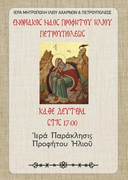 - Κάθε Δευτέρα, ώρα 17:00, Ιερά Παράκληση στον Προφήτη Ηλία.