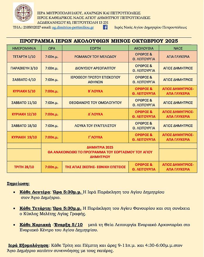 Πρόγραμμα ακολουθιών Οκτωβρίου 2025 Αγ. Δημητρίου Πετρ.