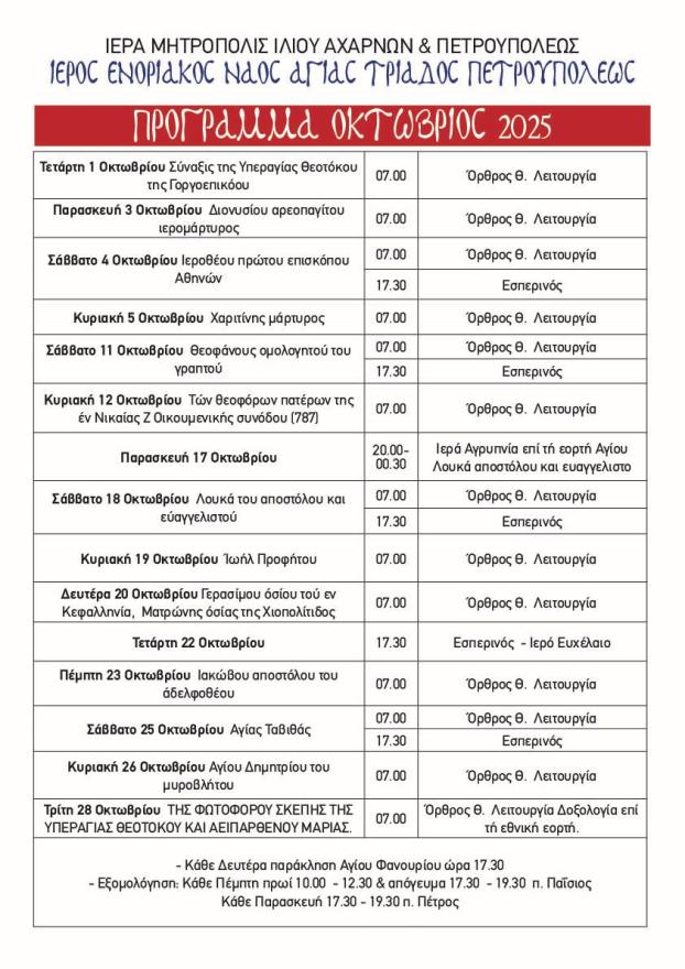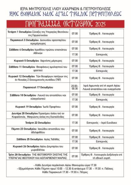 Δείτε το πρόγραμμα ακολουθιών για τον μήνα Οκτώβριο 2025, στην ενορία της Αγίας Τριάδας Πετρουπόλεως.