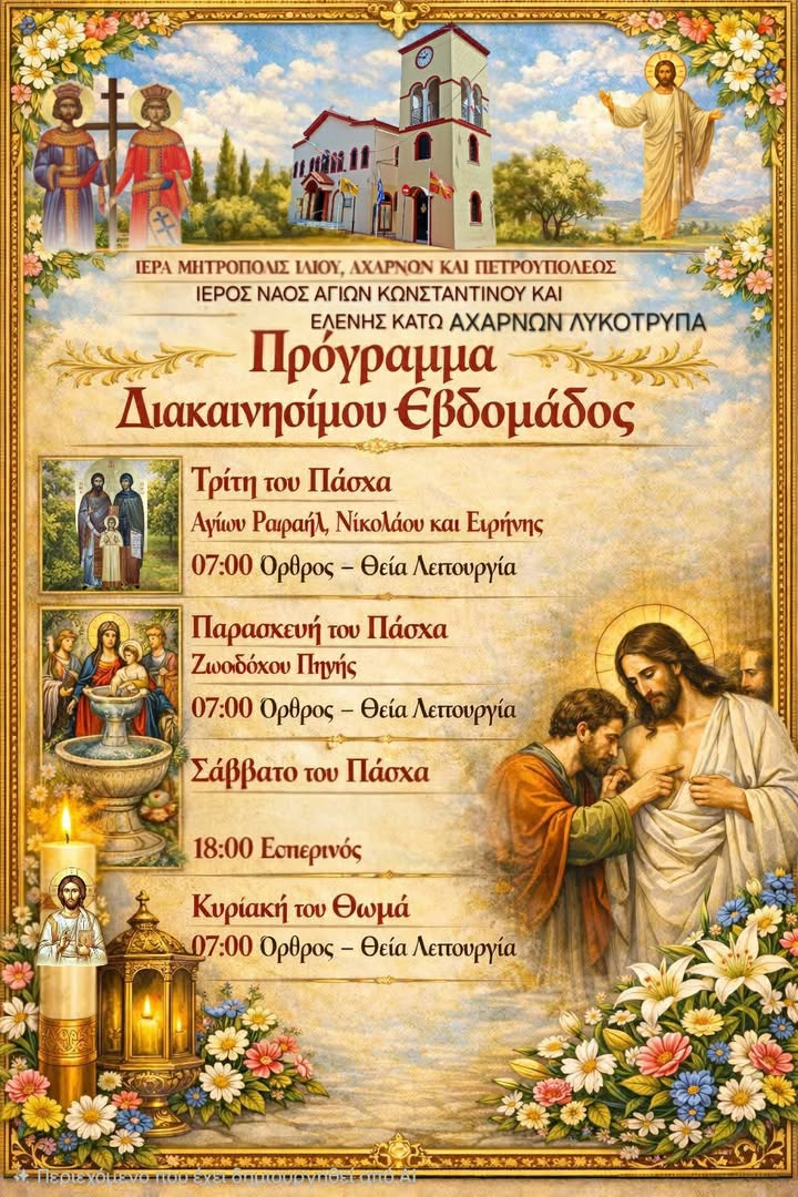 Πρόγραμμα Διακαινησίμου Εβδομάδας Αγ. Κων/νου Κάτω Αχαρνών