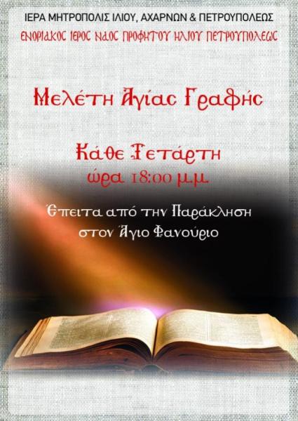 - Από την Τετάρτη 8 Οκτωβρίου 2025 και κάθε Τετάρτη στις 18:00, ιερά παράκληση στον Άγιο Φανούριο, ευλογία φανουρόπιτας και εν συνεχεία, μελέτη της Αγίας Γραφής, με θέμα τον Απόστολο και Ευαγγελιστή Ιωάννη.