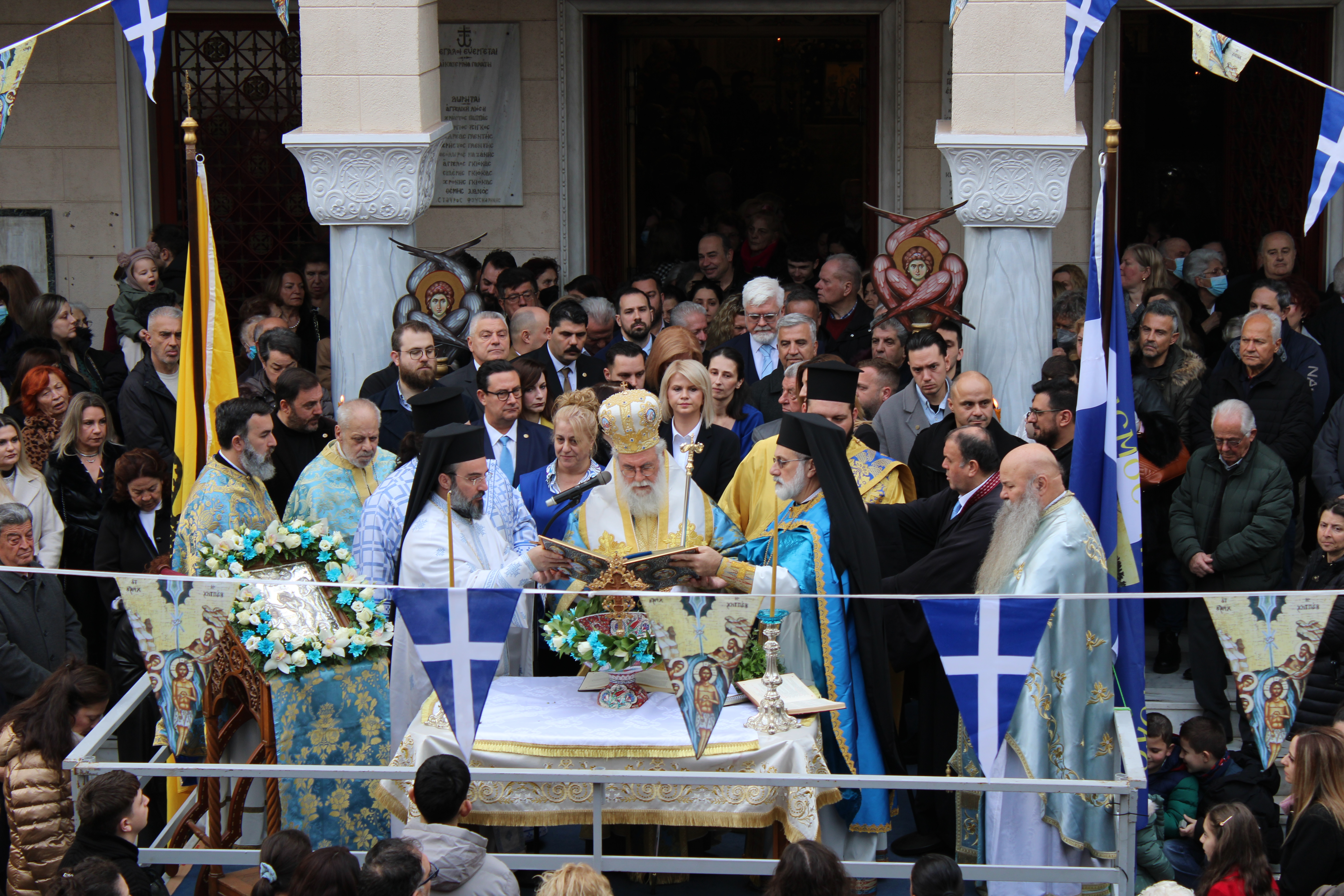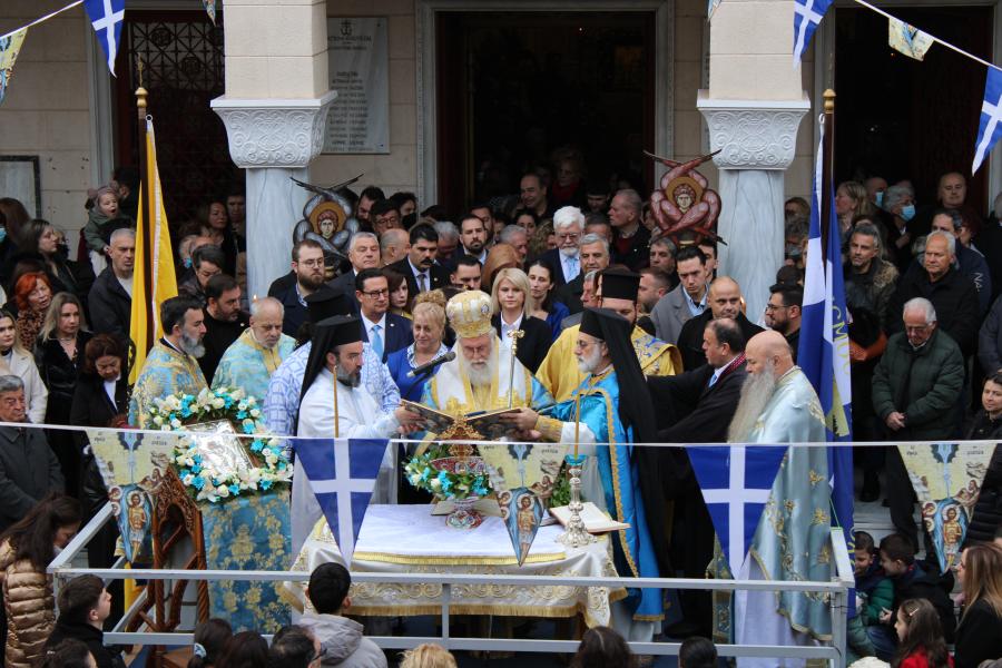 Πριν την απόλυση ο Σεβασμιώτατος με τους ιερείς, προπορευομένων των ψαλτών και των παιδιών του Ιερού και ψάλλοντας τα τροπάρια της ακολουθίας του αγιασμού των υδάτων έφθασαν με λιτανευτική πομπή στην εξέδρα, που είχε στηθεί στα προπύλαια του Ιερού Ναού, όπου τελέσθηκε με κάθε μεγαλοπρέπεια η Ακολουθία του Αγιασμού.